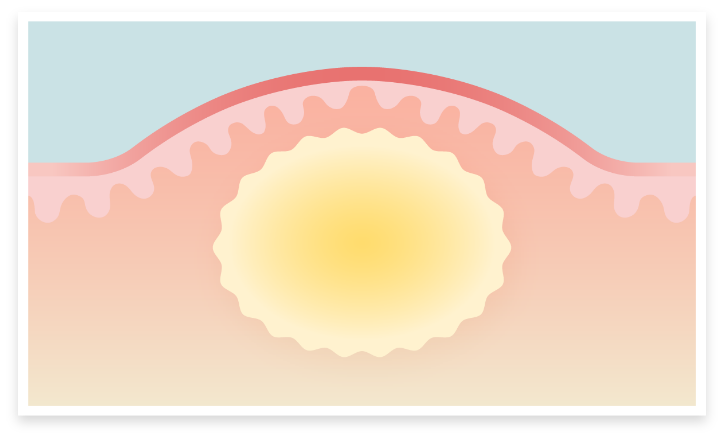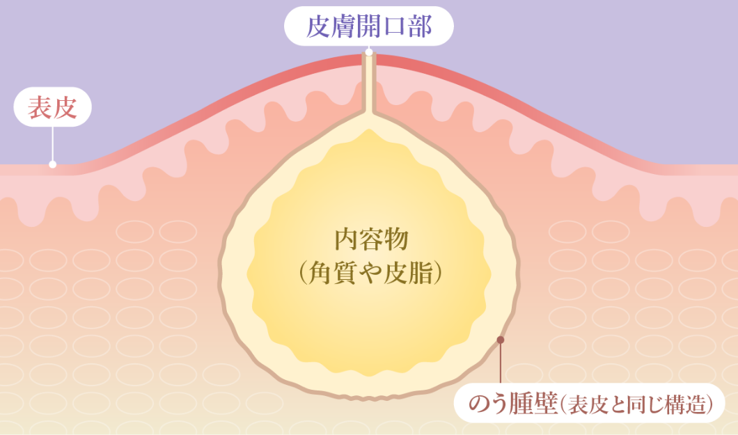 皮脂腺や毛穴の詰まり、皮膚の損傷などが原因で皮膚の下に袋状の構造が形成され、その中に老廃物がたまり発生します。