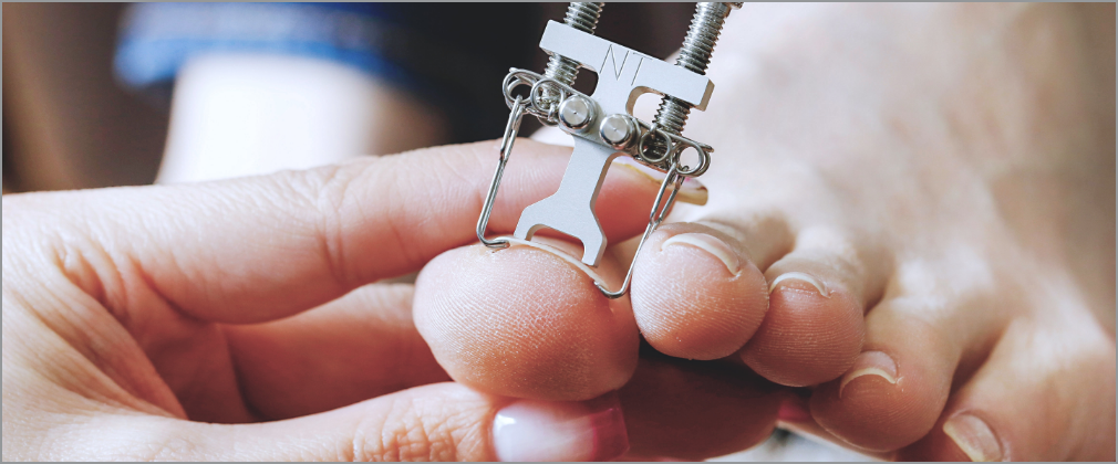 爪の弯曲を平らにする方法で、ワイヤーやプレートなどの矯正器具を使⽤して⽖の成⻑⽅向を改善する⽅法があります。⽖を持ち上げることで⽪膚への⾷い込みを軽減し、痛みを和らげます。私用する材料によっては保険適応外の治療となります。