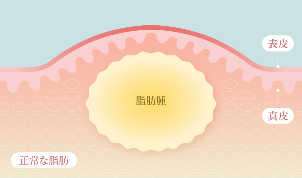 脂肪腫とは、皮膚の下に発生する良性腫瘍で、いわゆる「脂肪のかたまり」で脂肪細胞から構成される柔らかい腫瘍で、⼀般的には「シコリ」「オデキ」などと呼ばれます。