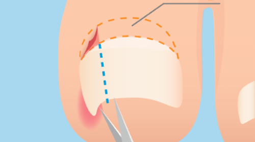 痛みが強い場合や、巻き爪の程度が大きい場合など、難治性の巻き爪に対しては、⼿術治療を行います。フェノールという薬剤で爪母(爪を作る根本部分)を焼灼し、その部分のみ爪を永久的に生えないようにする方法や、同じくレーザーを用いて爪母を焼灼する方法を用います。他にも部分的に⽖を切除する⼿術などがあります。これらの手術により再発を防ぐことが可能です。