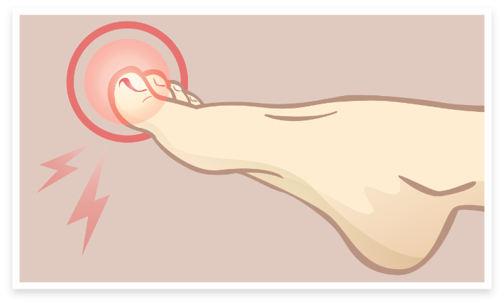 陥入爪は巻き⽖の部分に痛みが起こるだけでなく、巻き爪の痛みによって姿勢や歩き⽅が悪くなるため、ひざや腰の痛みの原因ともなります。
