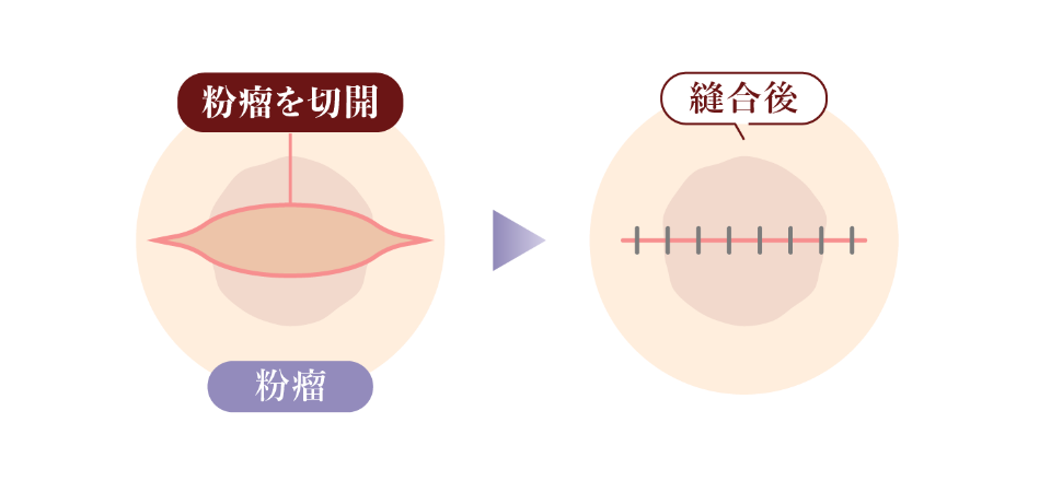 摘出手術: 粉瘤が大きい場合や、炎症を繰り返す場合、再発を防ぐためには、袋ごと摘出する手術が行われます。局所麻酔を用いて行われ、一般的には日帰り手術として実施されます。